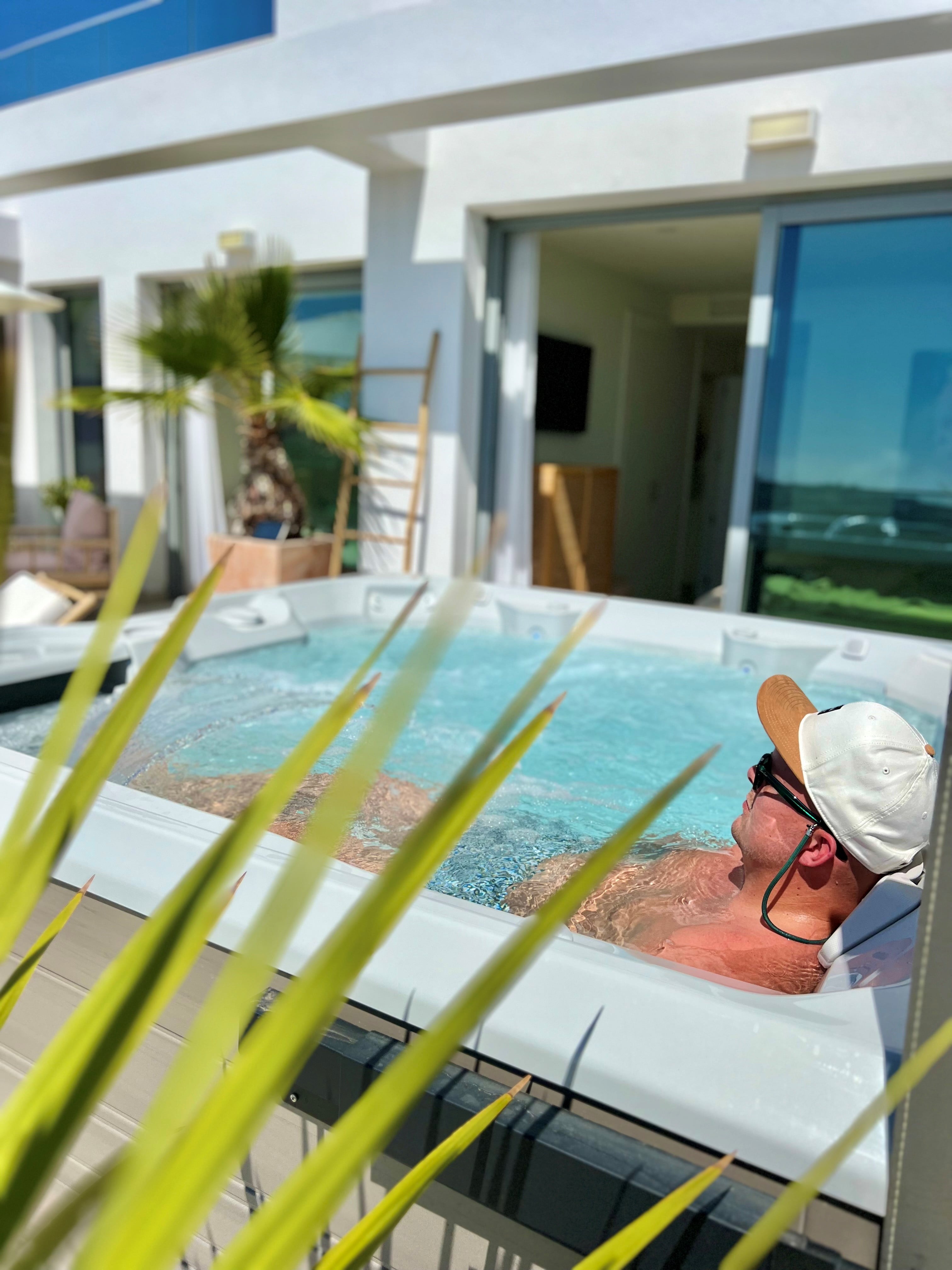 Terrassen er spækket med alt hvad du har brug for - napoleon Gril, jacuzzi, solstole og lounge områder.